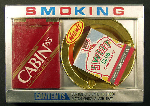 Sold milk chocolate gift box- Cabin cigarette biscuit pack. Small ashtray. Chocolate matchbook. Made in Japan. Japanese text.