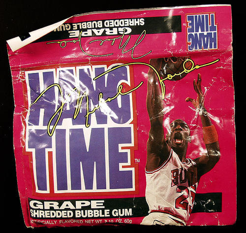 Hang Time brand grape bubble gum. Pouch looks like tobacco 40 g. pouch. Michael Jordan picture. Pink color.