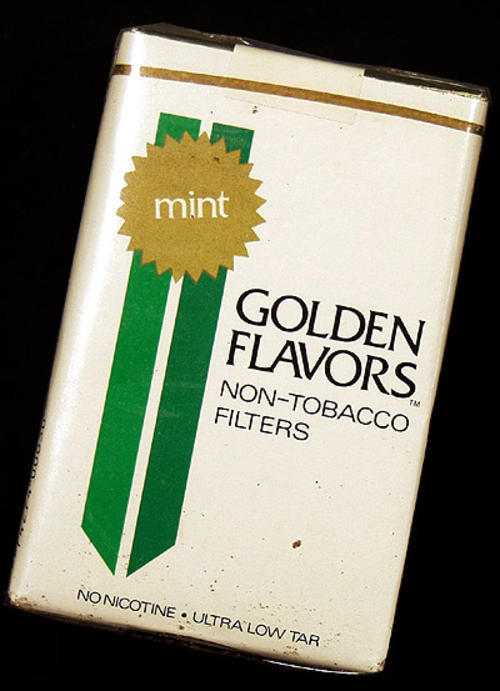 Cigarette substitutes- Golden Flavor non-tobacco filters (Peter Stokkebye Int'l). Same formula as Free. Package gives instructions on switching to Golden Flavors from conventional cigarettes promised that within 10 days nicotine withdrawal will be past and the consumer can smoke simply for flavor- mint flavored.