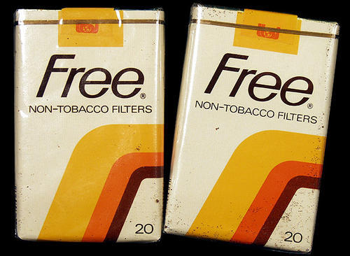Cigarette Substitutes- Free (International Brands, 1980). Wheat, cocoa, citrus. Package claims "contains no nicotine-- an addictive drug." Free is a new experience in smoking. After years of research, we have developed a non-tobacco smoke. The ingredients resemble tobacco, produces an ultra low tar brand that delivers a rich flavor and light aroma. When you quit smoking tobacco cigarettes, you may experience the discomfort of nicotine withdrawal, especially during the first 72 hours. DON'T GIVE IN! Stay with Free for a full 10 days and completely eliminate nicotine from your system. Then you can smoke when you want to not because you have to. If you choose to smoke, FREE is the sensible alternative. We think you'll find switching to Free so worthwhile that you'll never risk smoking nicotine cigarettes again.