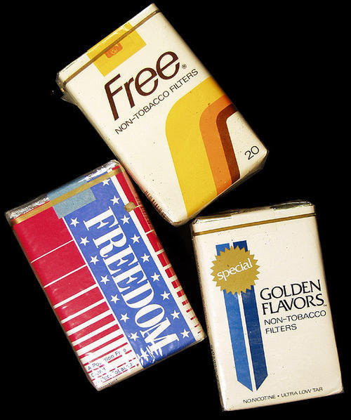 Cigarette substitutes- Free (International Brands, 1980). Wheat, cocoa, citrus. Package claims "contains no nicotine-- an addictive drug." Golden Flavors Non-Tobacco Filters (Peter Stokkebye Int'l), same formula as Free. Package gives intructions on switching to Golden Flavors from conventional cigarettes promising that within 10 days nictoine withdrawal will be past and the consumer can thenceforth smoke simply for flavor. Freedom (Claytoy, Ltd. 1976)- 85 mm long sections of cellulose acetate wrapped in cigarette paper.