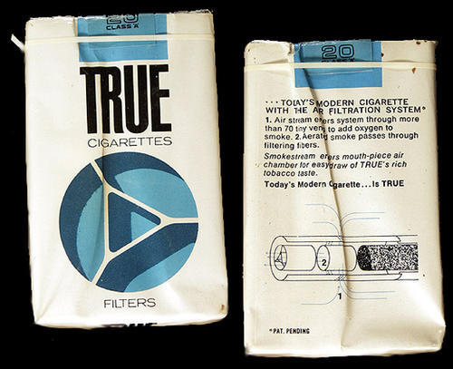 Filter Innovation... Today's Modern Cigarette with the Air Filtration System. 1) Air Stream enters system through more than 70 tiny vents to add oxygen to smoke. 2) Aerated smoke passes through filtering filters. Smokestream enters mouth- piece air chamber for easy draw of True's rich tobacco taste. Today's Modern Cigarette... is True.