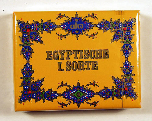 20 cigarettes- in a yellow box, blue design. Made in Germany. From a NYC tobacco shop at 42nd and Broadway.