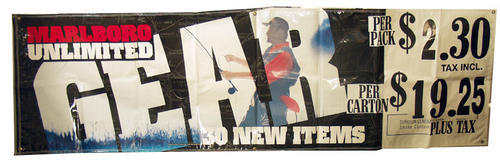 Marlboro Unlimited vinyl sign- black, red, white. Gear catalog advertisement and current pack price sign- sticker numbers used for price stickers cover health warning. Pictures fishing.
