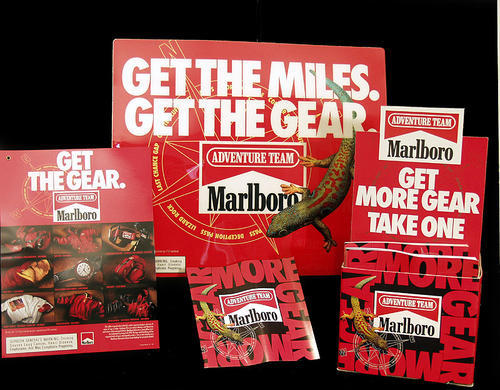 Philip Morris Marlboro Adventure Team Take One Display, includes catalogues, posters, small and medium signs, and buttons