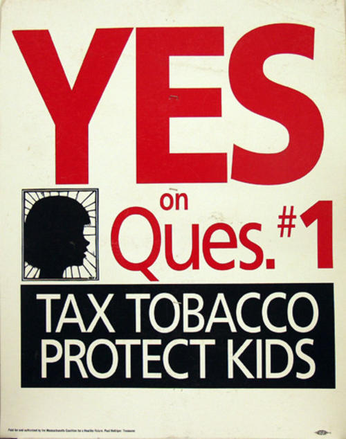 Sign- Massachussetts Coalition for a Healthy Future sign pushing for voters to vote for a tobacco tax.