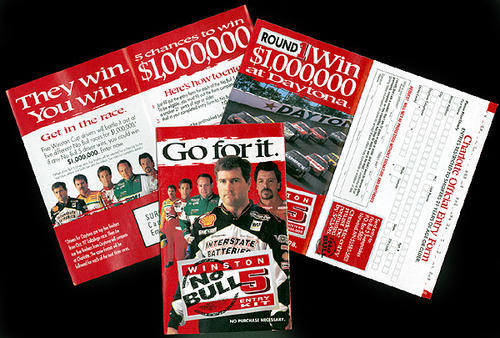 Pamphlet to enter into a sweepstakes. If one of the 5 Winston sponsored drivers wins, then a smoker who already entered has a chance to win. $1,000,000.00.