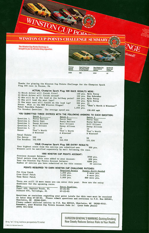 Winston cup points summary with detailed point earnings from a questionnaire. Surgeon general's warning.
