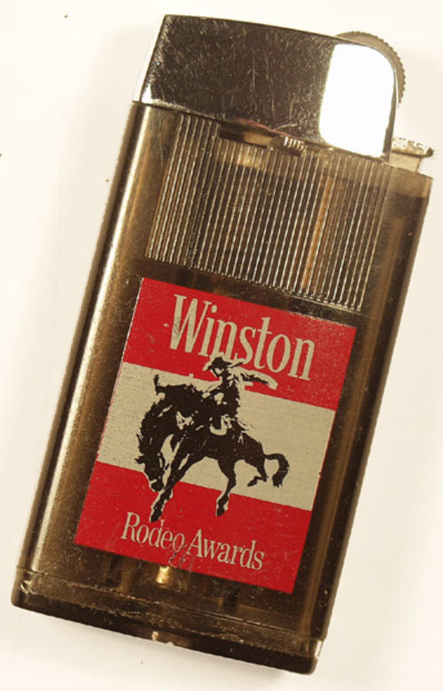 Winston Lighter. Tinted plastic body and metallic top. Winston-Rodeo Horse Rider Emblem printed on front. By Scripto, USA. White sticker with 2332 hand written stuck on lighter.