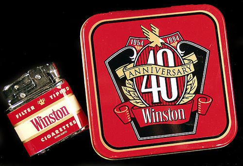 Decorative Winston 40th Anniversary Tin. Square red tin container with casing inside to hold lighter. Short, flat, smooth red and white Winston lighter. Lighter made in China and tin made in Hong Kong.