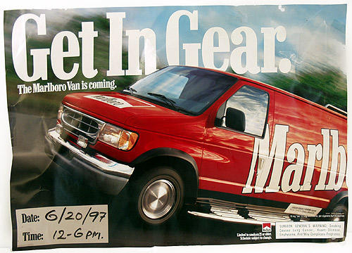 Sign/poster giving date and time of when Marlboro Van would come double sided.