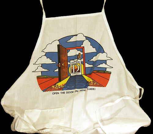 Apron with image: open door with pack in the door with sky and clouds behind. "Open the door on the new decade." White apron.