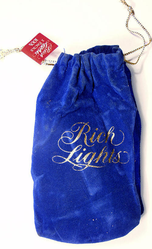 Blue velvet pouch with gold script "Rich Lights." held 2 packs 100s. Inside offer for duffles and coupon for 25 cents off next pack.
