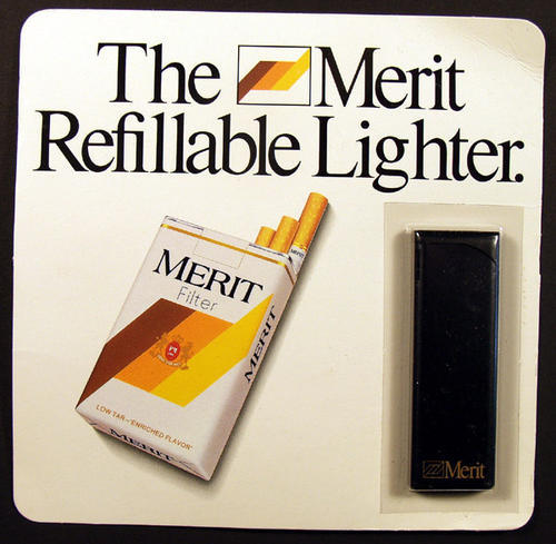 "The Merit refillable lighter." Shows pack. Black lighter with gold "Merit" and logo.