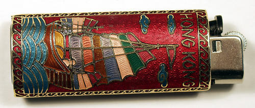 Enameled lighter of ship at sea and "Hong Kong". (Geometric and stylized image) Bag reads "Star train. Rice Paddy Babies Hong Kong."
