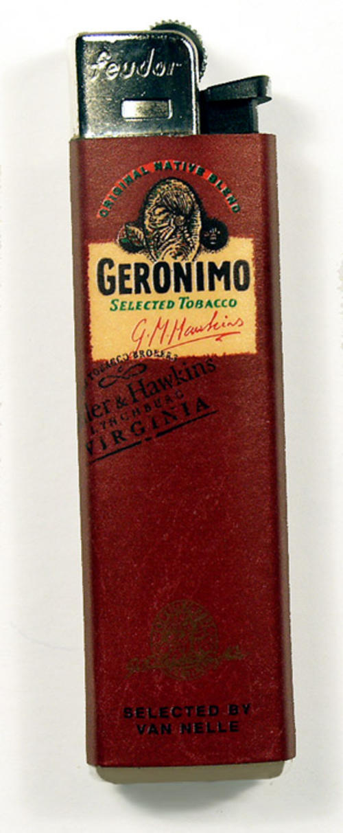 Brick red lighter with Geronimo logo. "Miller & Hawkins Lynchburg Virginia Leaf Tobacco Brokers" logo. Fendor lighter. International.