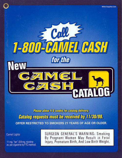 In store, glossy sign. Advertising the new Camel merchandise; catalog available by calling a toll-free number. Surgeon general's warning and merchandise both shown on blue and yellow sign.