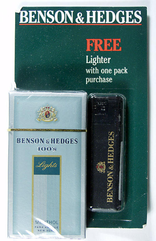 Free lighter with one pack purchase. 1991. 100s lights. Menthol. Logo in gold on black lighter.