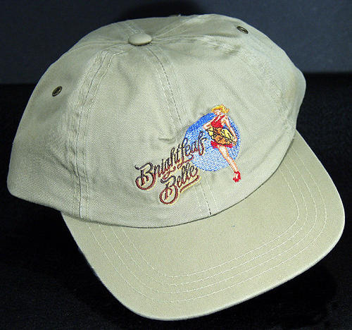 Khaki hat with "Bright Leaf Belle" with Image of Woman holding a tobacco leaf with the moon behind her. Carolina Gold embroidered on the back in brown.