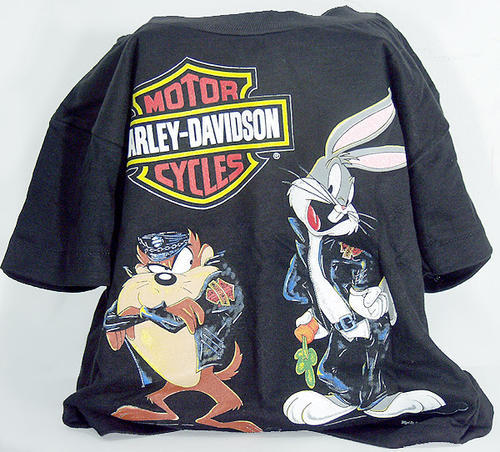 Black t-shirt with Tazmanian Devil and Bugs Bunny in motorcycle gear on front. Back shows the back of the image on the front. Kids size.
