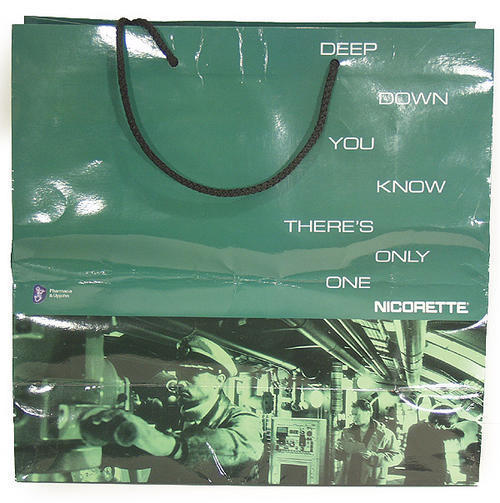 Nicorette shopping bag. Green and black,paper coated with slogan "Deep down, you know there's only one." The botton has a photo of marines in a submarine.