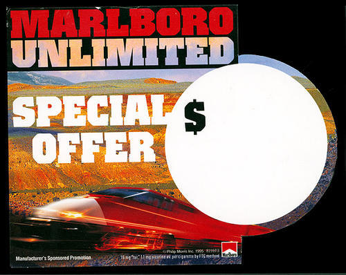 Adhesive sign hanging from Marlboro Unlimited- train moving through desert. Advertising special offer price.