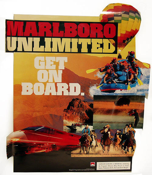 Marlboro Unlimited "Get on board" poster. Pictures train, cowboys, speedboat, fishing, rafting, hot air balloon, and desert.