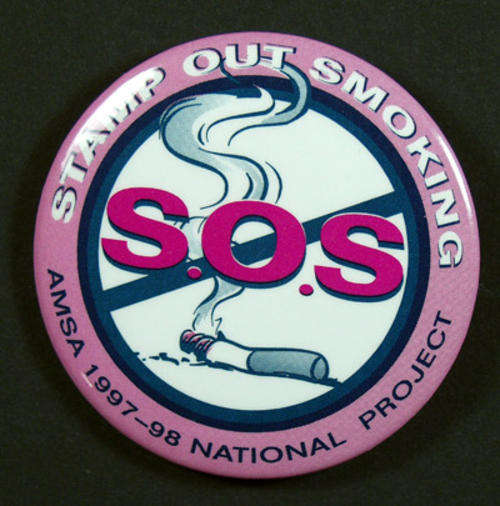 "Stamp out Smoking" button with picture of cigarette with slash through it.