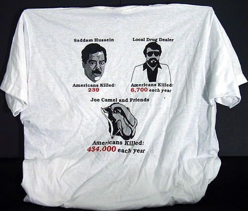 T-shirt "Comparing number of Americans killed by Saddam Hussein, local drug dealers, and Tobacco companies."