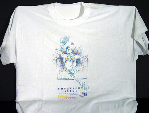 From Medical College of Georgia- Emphysema t-shirt, Dead Man Chew sticker, and yellow teeth poster. Receipt shows total was $16. T-shirt is for Emphysema Swims Championship. An athlete jumps for a pack of cigarettes, athletes' lungs are outlined.