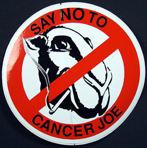 Sticker. No Smoking Sign- cigarette replaced by "Cancer Joe."