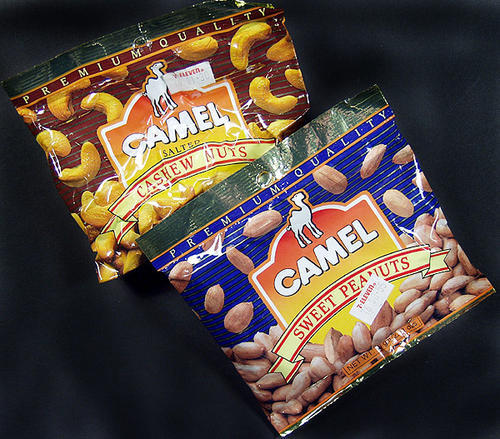 Peanuts sweetened and cashews available in packs. Made in Singapore, purchased at a 7-eleven in Singapore. $1.30 and 55 cents. Camel brand.