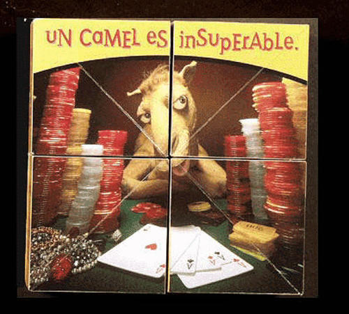 Camel - "Un camel es insuperable." Camel Joe is reincarnated for the foreign market. The text translates to "A Camel is insurmountable." Puzzle of Joe Camel sitting in front of stacks of poker chips with a card hand of 4 Aces.