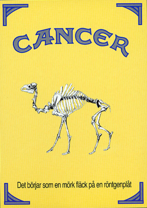 Postcard "Cancer" with skeleton of a camel on yellow background. International (Dutch?) Mock Camel logo.