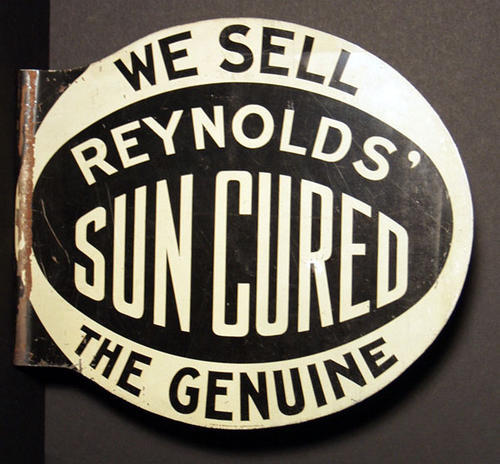 Oval steel tin, circa 1910. "We sell Reynolds' sun cured - the Genuine". Antique