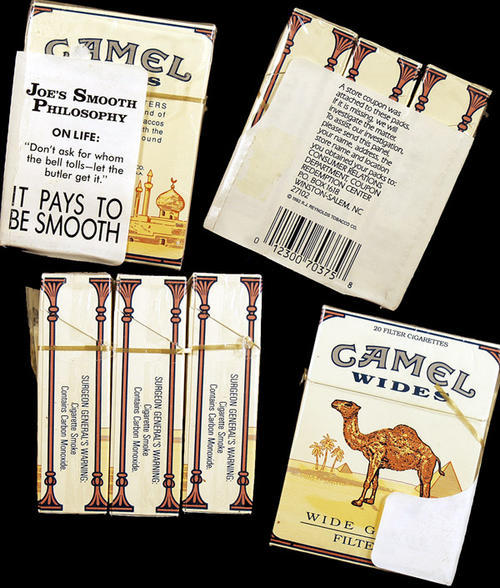 Camel Wides Filters, 3 pack, wrapper reads: "Joe's Smooth Philosophy on Life: 'Don't ask for whom the bell tolls - let the butler get it.' It pays to be smooth." A coupon was attached but no longer is. No Camel Cash.
