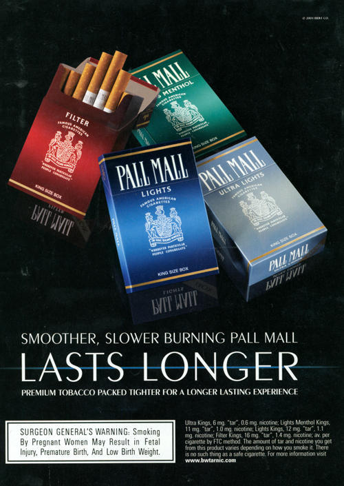 Ad for Pall Mall cigarettes. Features different versions of Pall Mall:Filter, Lights, Menthol, Ultra Lights. "Smoother, slower burning Pall Mall, Lasts Longer; Premium tobacco packed tighter for a longer lasting experience".
