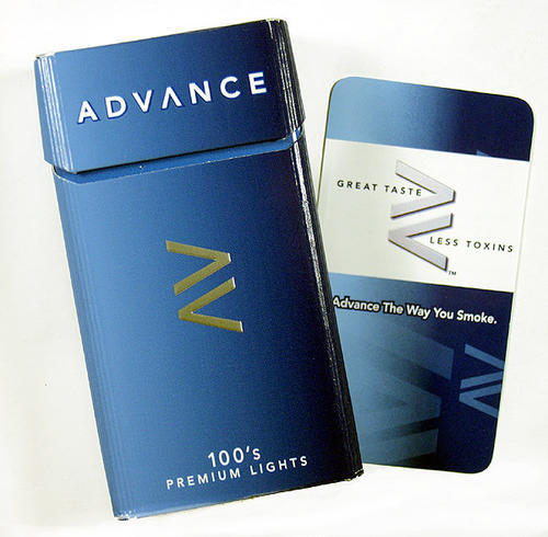 Cigarette pack of Advance cigarettes, 100's Premium Lights. Blue packaging. on back of pack says, "Great Taste, Less Toxins. The Future of smoking starts here, with ADVANCE. The innovative cigarette that gives you full rich taste and less toxins. Advance has a better formula for plesure: the combination of a patented tobacco curing process and trionic filter reduces toxins while giving you all the smoking satisfaction you want.