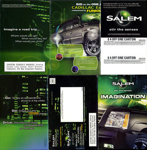 Direct mail from Salem in promotion of its Stir the Senses Tour Series and related sweepstakes. The cover includes a partial image of a black SUV with the word "Imagination" running across the cover. Inside is a fuller image of a black Cadillac Escalade ESV. Text: "Imagine a road trip...Where would you go? What would you do? What would you drive? Bid on the ONE AND ONLY Cadillac Escalade ESV customized by Funkmaster Flex. Experience the last leg of Salem's 2004 Stir the Senses Tour Series IN STYLE."