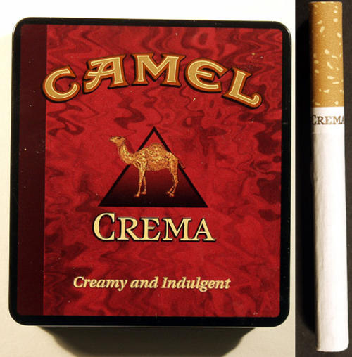 One of Camel's Exotic Blends, flavored cigarettes: "Camel Crema, Creamy and Indulgent" The cigarettes are made with detailed, colorful, "designer" filters and wrapping paper. The cigarettes are packaged in a colored, elegant tin. Picture of Camel in burgundy colored setting. Inside of tin cover says: "...By introducing a hint of vanilla to our unique blend, Camel Crema delivers a creamy, indulgent flavor that offers an intriguing and pleasurable smoking experience". Initially these exotic blends were only available at Camel events or by special order. Now available in most general tobacco retail outlets. luxury cigarettes.