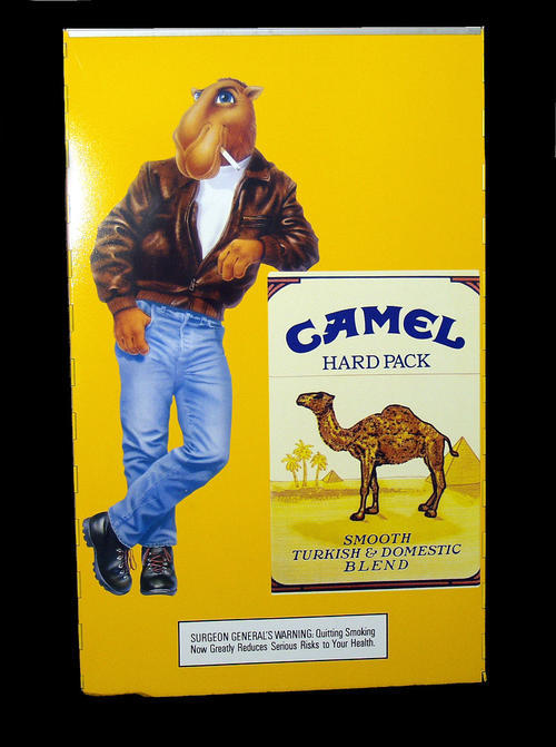 Metal fold-open box in yellow. Opens by hinges and features Joe Camel leaning on a cigarette pack--Hard Pack. Surgeon General's Warning clear on both front and back panals. Camel on side.