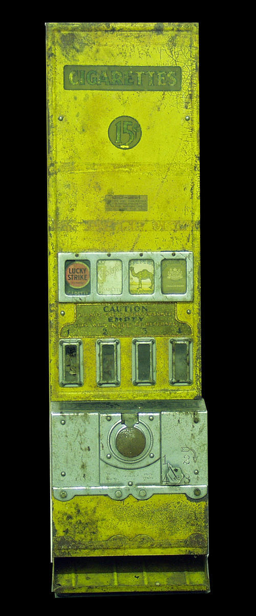 Antique cigarette dispenser-- 15 cents per pack. Features several brands: Camel, Lucky Strike, Chesterfield, & Phillip Morris.
