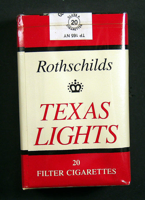 Cigarette pack in hard, plastic case. "Texas Lights"