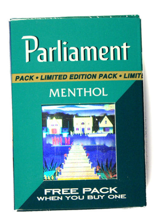 "Buy one get one free" Parliament menthol cigarettes. Comes with one regular menthol pack and one limited edition menthol pack that features a hologram image on the pack. Hologram image features houses, boat and people by water - summer theme.