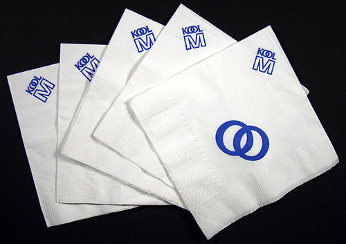 Napkins branded by KOOL. "KOOL" and a large "M" (for menthol/house of menthol)in one corner of the napkin. In the middle of the napkin is the overlapped "O" logo/design which models the design/logo KOOL uses to represent its brand name. Napkins found on the bar at Maxwell's in Hoboken, NJ.
