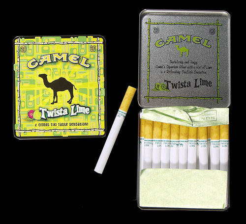 A special summer edition Camel Exotic Blend -"Twista Lime", a "citrus tiki taste sensation." These flavored cigarettes are stated to be flavored with "a hint of lime." This special tin is black with a colorful cover, featuring graphic geometric designs in hues of yellow amd green. On the inside of the cover, text describes the cigarettes: "Tantalizing and Tangy. Camel's signature blend with a hint of lime is a refreshing surfside sensation." The cigarettes are are made with designer paper, with palm trees designs on the filer, and are held together in a lime green foil wrap. An insert contains the following text: "Camel presents Exotic Blends - a collection of sophisticated indulgences created by complementing our smooth yet flavorful Turkish and Domestic blend with international spices, flavors and rare tobaccos...".