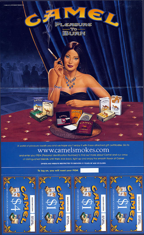 Direct mail from Camel. On the cover an attractive exotic model is sitting at a bar and smoking a cigarette in a long cigarette holder. "Experience a World of Pleasure." Inside the woman presents the families of Camel cigarettes: the Turkish blends, the Exotic Blends, and the traditional Camels. Text under picture: "A world of pleasure awaits you and we hope you'll enjoy it with these attached gift certificates. Go to www.camelsmokes.com and enter your PID# to find out more about Camel and our array of distinguised blends. Until then, kick back, light up and enjoy the smooth flavor of Camel." 4 coupons are attached: 3 for $1.00 off per pack, and 1 for $4.00 a carton.