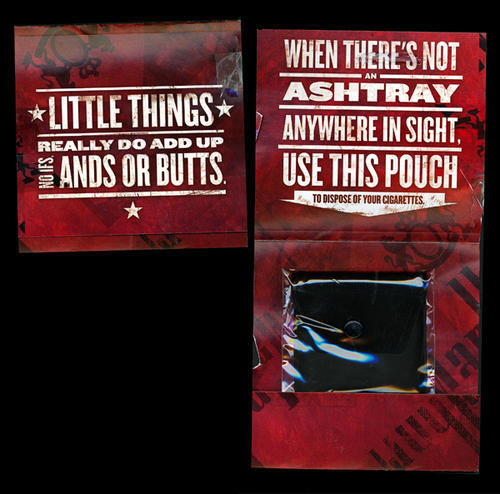 Text inside: "When there's not an ashtray anywhere in sight, use this pouch to dispose of your cigarettes. Help curb a common form of litter in our country."