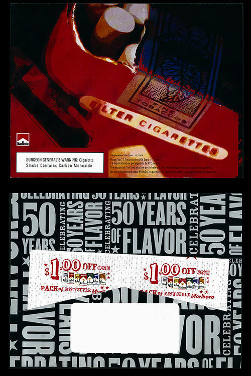 Direct Mail from Marlboro in celebration of Marlboro's 50th Anniversary. Black and silver mailer holder with the words "Celebrating 50 Years of Flavor" repeated. The holder includes 3 $1.00 per pack coupons.