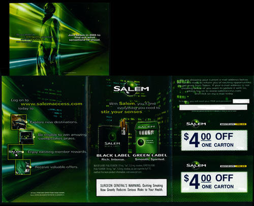 Direct mail from Salem. Cover features a mysterious image of a man smoking. Text: "Do you dream of intriguing adventures and the mystery of new locations?" Inside, the piece advertises Salem's Black and Green Label blends, as well as the features of Salem's website. Five coupons were included: 4 $4.00off one carton, and 2 $1.00off two packs coupons.